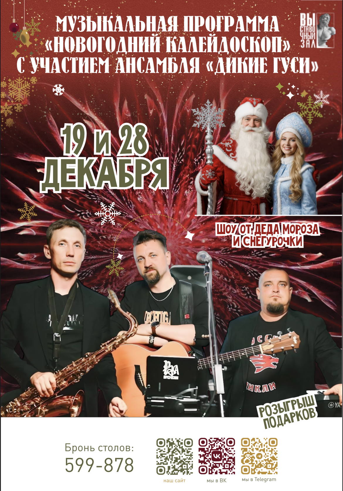 19 и 28 декабря в 19:30 в арт-кафе «Выставочный зал» состоится незабываемая музыкальная программа «Новогодний калейдоскоп» с участием замечательного ансамбля «Дикие гуси».