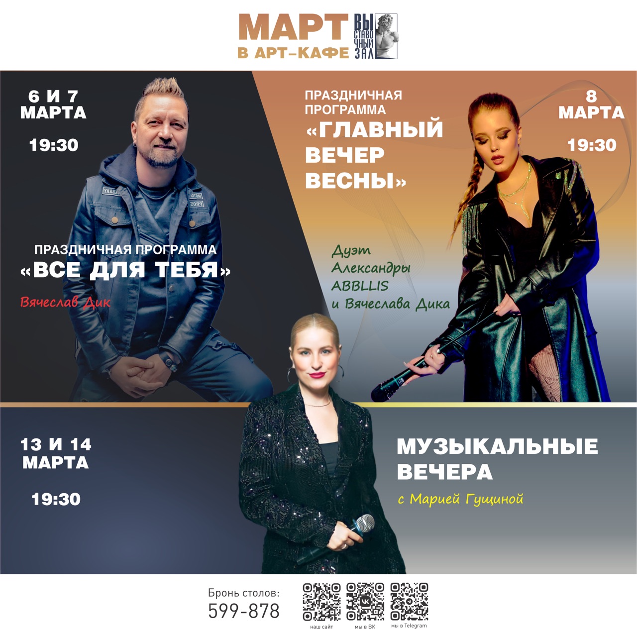 Друзья, мы с готовы к самым нежным выходным в году, посвящённым Международному женскому дню! Приглашаем вас провести вечера в уютной атмосфере арт-кафе «Выставочный зал» в компании прекрасной музыки и хорошего настроения.