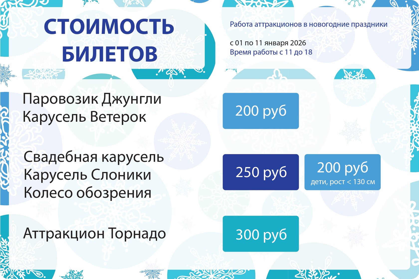 С 1 по 11 января мы запускаем аттракционы для детей и взрослых, чтобы каждый день праздников был наполнен весельем, смехом и незабываемыми впечатлениями.
